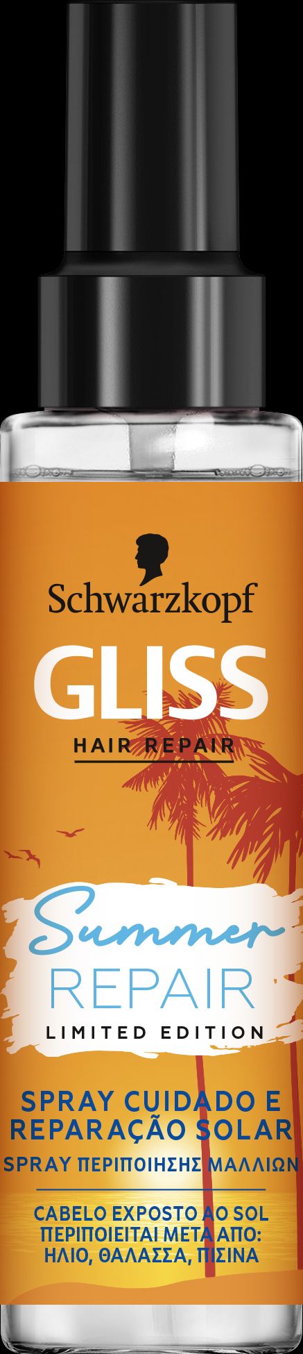 Η σειρά Gliss Summer repair επανορθώνει τα ταλαιπωρημένα μαλλιά από ήλιο, θάλασσινό νερό και χλώριο ενώ ταυτόχρονα προστατεύει και από το ξεθώριασμα του χρώματος. Απολαύστε το περιποιητικό σαμπουάν επανόρθωσης Gliss Summer Repair με έλαιο βερίκοκου + φίλτρο UVA/UVB: -Απομακρύνει τα υπολείμματα από τα αντιηλιακά προϊόντα , το θαλασσινό νερό και το χλώριο -Επανορθώνει τις φθορές από τον ήλιο -Προστατεύει τα μαλλιά από την ξηρότητα και το ξεθώριασμα του χρώματος.