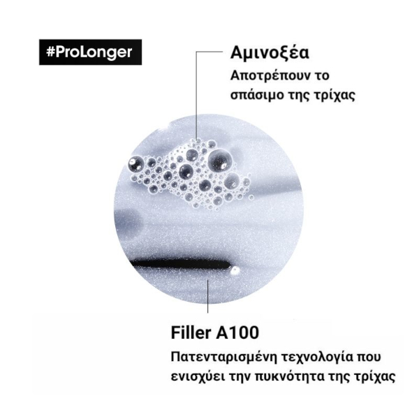 Το Pro Longer Σαμπουάν της L’Oreal Professionnel Κατά της Ψαλίδας, με τη δύναμη του FILLER-A100 και των Αμινοξέων, αποτελεί την ιδανική περιποίηση για μαλλιά με λέπτυνση και τάση για ψαλίδα στις άκρες. Όταν χρησιμοποιείται με τις Αμπούλες Συμπυκνωμένου Ορού Κατά τις Ψαλίδας, προσφέρει ενδυνάμωση και λάμψη στα μήκη, αλλά και μεγαλύτερη πυκνότητα μακράς διάρκειας στις άκρες. Ιδιότητες • Επανορθώνει άμεσα την τρίχα • Πιο δυνατά και λαμπερά μαλλιά • 94% λιγότερο σπάσιμο • Μείωση της ψαλίδας κατά 17% • 5x πιο λαμπερά μαλλιά Τρόπος εφαρμογής • Εφαρμόστε σε βρεγμένα μαλλιά • Αφροποιήστε και κάντε μασάζ στο τριχωτό και στα μαλλιά • Ξεβγάλτε καλά και επαναλάβετε εάν χρειαστεί • Ιδανικό για συχνή χρήση Σε περίπτωση επαφής με τα μάτια, ξεπλύνετε αμέσως