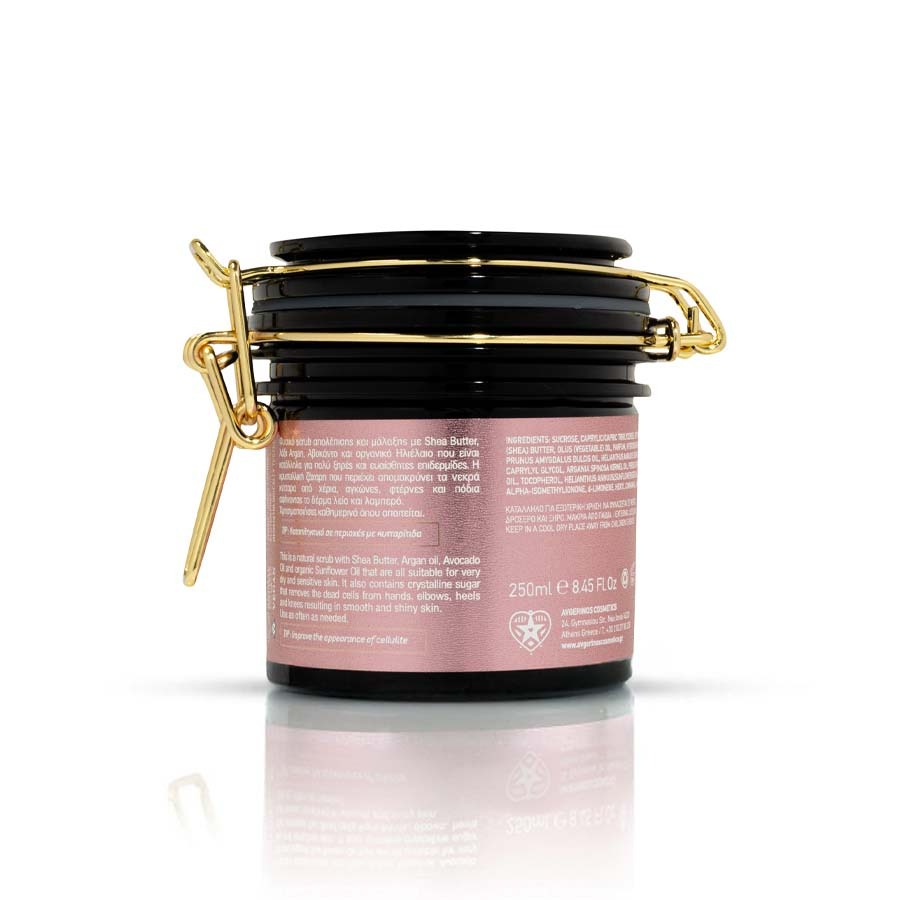 Προϊόν απολέπισης με κόκκους ζάχαρης, έλαια φυσικής προέλευσης, αντιοξειδωτικούς παράγοντες. Απομακρύνει τα νεκρά κύτταρα από την επιφάνεια και επαναφέρει άμεσα λεία και απαλή υφή στα σημεία του σώματος με έντονη ξηρότητα, στις φτέρνες, στους αγκώνες και στα γόνατα. Οι κυκλικές κινήσεις μασάζ την ώρα της εφαρμογής βελτιώνουν την κυκλοφορία και έχουν αποσυμφορητική δράση με αποτέλεσμα την αισθητή λείανση της κυτταρίτιδας και της όψης φλοιού του πορτοκαλιού.