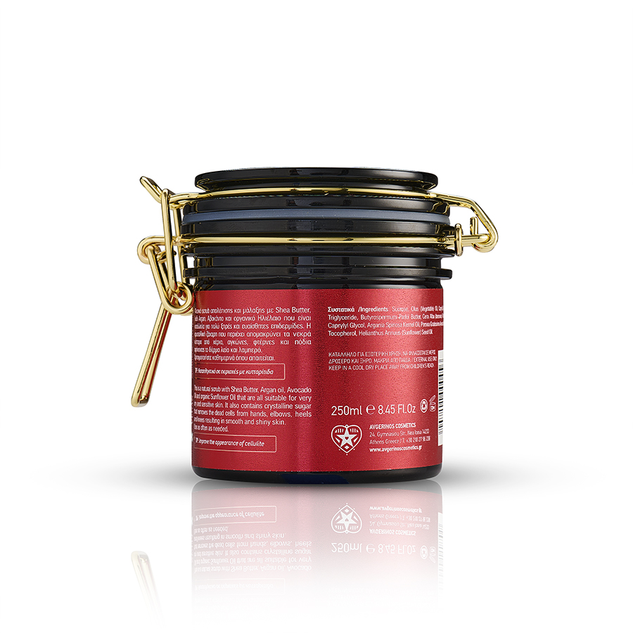 Προϊόν απολέπισης με κόκκους ζάχαρης, έλαια φυσικής προέλευσης, αντιοξειδωτικούς παράγοντες. Απομακρύνει τα νεκρά κύτταρα από την επιφάνεια και επαναφέρει άμεσα λεία και απαλή υφή στα σημεία του σώματος με έντονη ξηρότητα, στις φτέρνες, στους αγκώνες και στα γόνατα. Οι κυκλικές κινήσεις μασάζ την ώρα της εφαρμογής βελτιώνουν την κυκλοφορία και έχουν αποσυμφορητική δράση με αποτέλεσμα την αισθητή λείανση της κυτταρίτιδας και της όψης φλοιού του πορτοκαλιού.