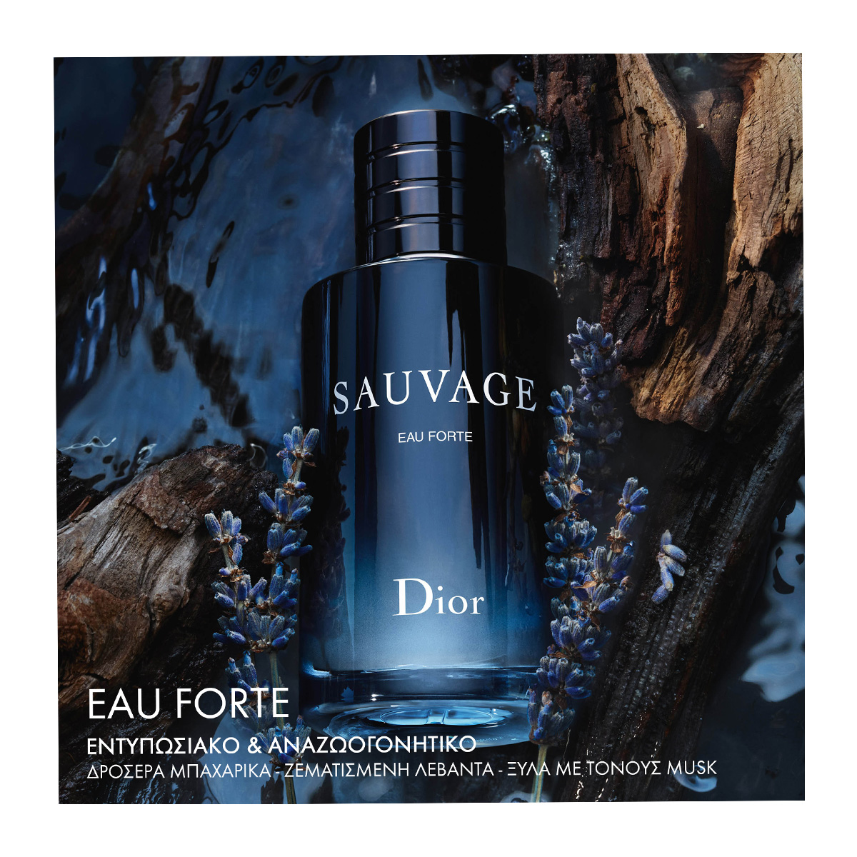 Αυτή η δημιουργία εξερευνά το αχαρτογράφητο έδαφος ενός δροσερού και πικάντικου fougère. Σαν καταρράκτης, το Sauvage Eau Forte απελευθερώνει φρεσκάδα και ένταση. Μια υδάτινη σύνθεση αναμιγνύεται με μια αρωματική ελαιώδη σύνθεση, για να δημιουργηθεί αυτό το eau υψηλής συγκέντρωσης με τη γαλακτερή απόχρωση.